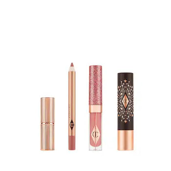 This LIMITED-EDITION kit includes a full-size Hyaluronic Happikiss hydrating lipstick balm in my ICONIC nude-pink shade, travel-size PILLOW TALK MEDIUM Lip Cheat and Matte Revolution for a deeper berry-pink kiss of colour, plus a travel-size tube of my sparkling diamond Jewel Lips gloss!