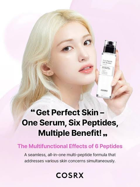 The 6 peptide skin booster contains 6 multi peptides that boost overall skin condition such as pore & sebum, firmness, fine lines, skin texture, skin tone and soothing. It is perfect to use as the first step of skincare routine to prep and boost.
