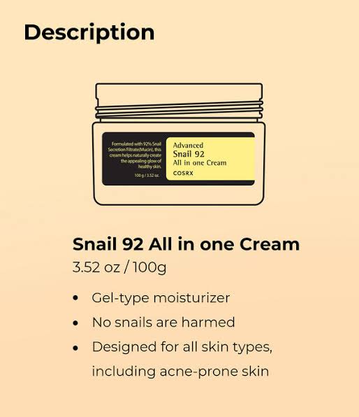 The Cosrx Advanced Snail 92 All in One Cream is a snail cream to prevent aging. It is full of collagen to maintain healthy and wrinkle free skin. As a moisturizing cream made with all-natural snail secretion and active ingredients, it provides plenty of nutrients to the skin and protects damaged skin while supplying moisture within.