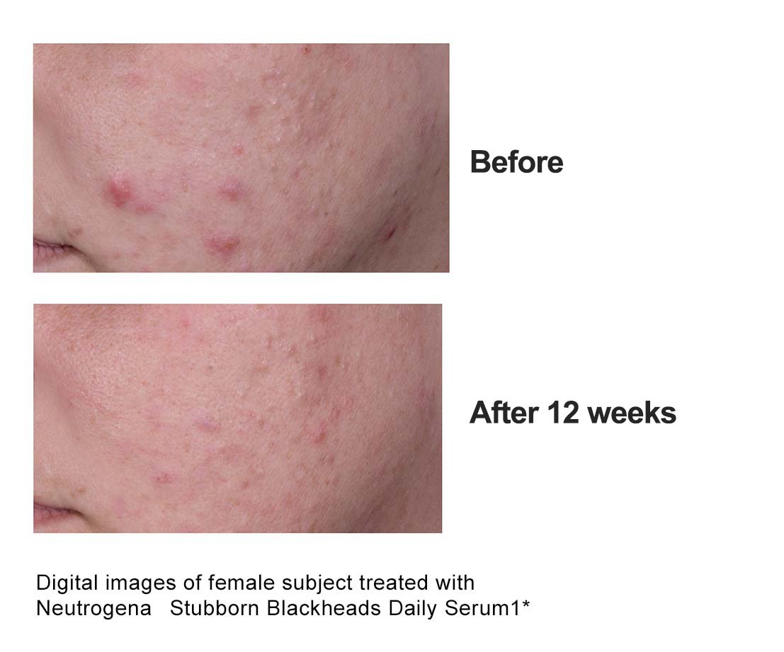 Neutrogena® Stubborn Blackheads Serum is the new way to fight blackheads. Put on and leave on to melt away blackheads, visibly clearing clogged pores and helping to eliminate stubborn acne in as little as 3 days. Designed for oily, acne-prone skin, this oil-free face serum visibly clears clogged pores to help eliminate stubborn breakouts and blackheads.
